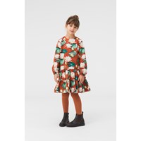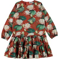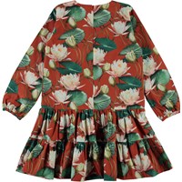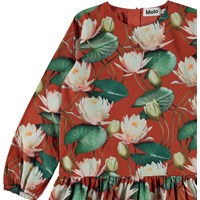 Cora is een bruine popeline jurk met lange mouwen en een print van roze waterlelies. Het heeft een ritssluiting aan de achterkant.