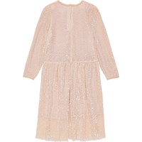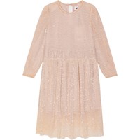 Zalmkleurige paillettenjurk met een ronde hals en lange mouwen. De jurk heeft een smalle zoom rond de mouwen. De prachtige paillettenrok valt zwaar over de knieën en de delicate onderrok maakt de jurk comfortabel om te dragen.