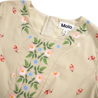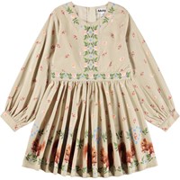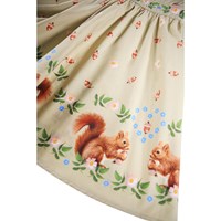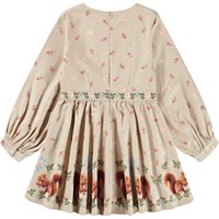 Beige jurk met lange mouwen gemaakt van biologisch katoenen popeline met een verborgen rits aan de achterkant om het gemakkelijk aan te trekken. De jurk heeft paneeldetails rond de halslijn, langs de borst en rond de taille versierd met bloemen. De rok en mouwen hebben kleine eikels en op de onderkant van de jurk is een print van kleine eekhoorns.
