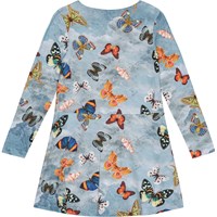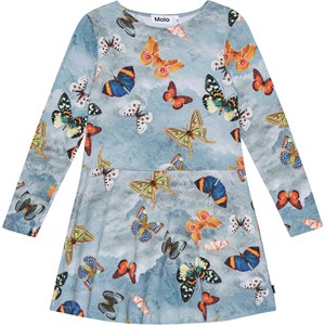 Blauwe jurk met lange mouwen van rekbaar biologisch katoen met een ronde hals, aansluitende mouwen en lijfje. De rok valt los en reikt tot halverwege de knie. De jurk is gemakkelijk aan te trekken en comfortabel om te dragen. Het heeft een print van kleurrijke vlinders die dansen op een hemel van verschillende tinten blauw.