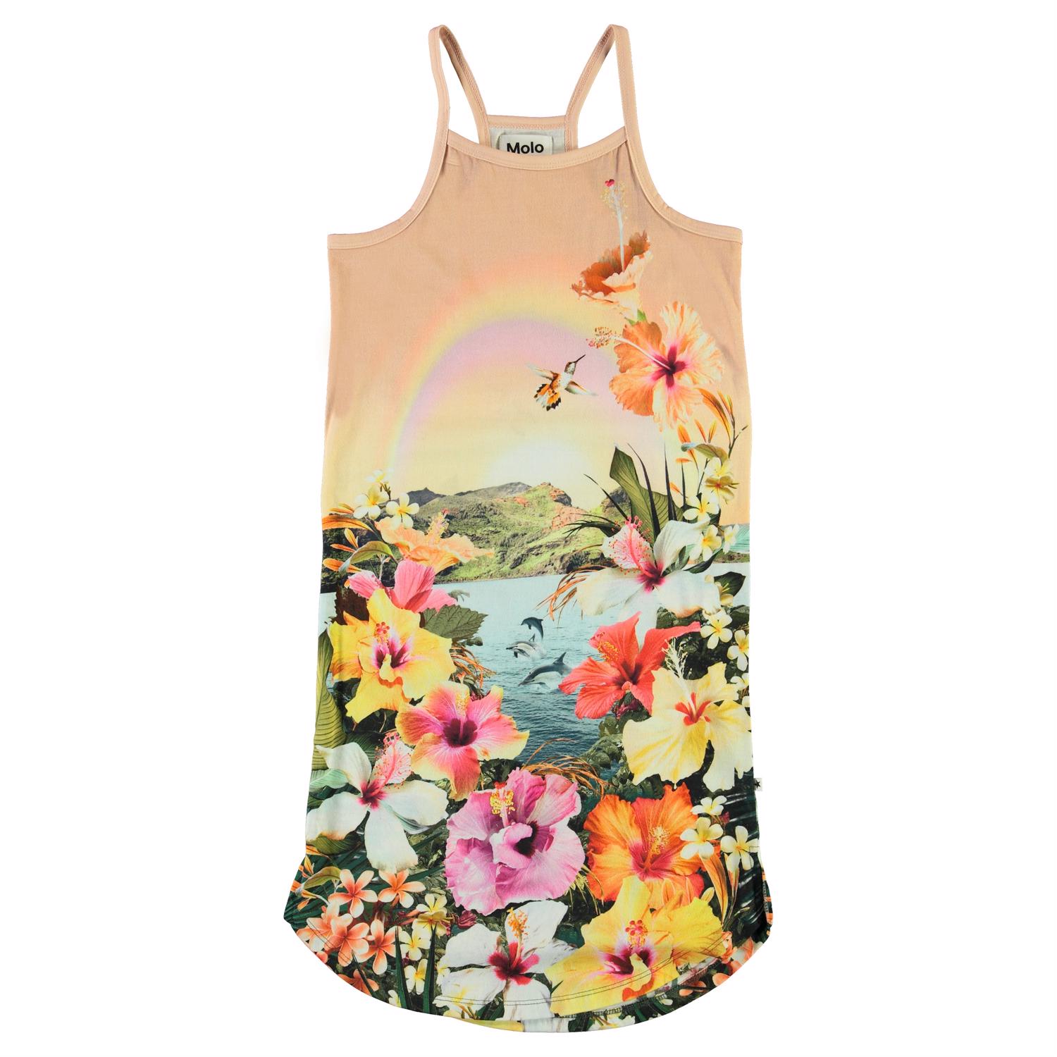 Cortney is een jurk met bandjes met een exotische print van bloemen, de oceaan en dolfijnen. De jurk is van 100% katoen en perfect voor een uitstapje naar het strand.