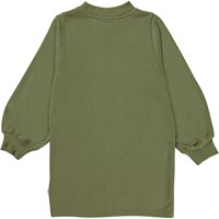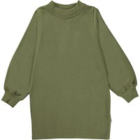 Corvina is een mosgroene knielange sweater jurk. De jurk heeft een ruimvallende pasvorm en een ribboord rond de hals en mouwen.