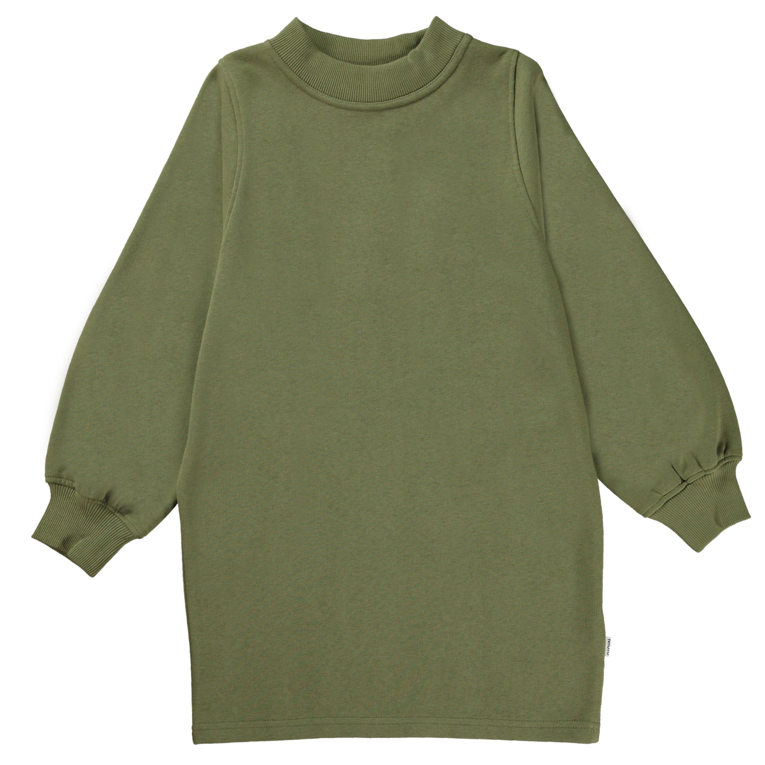 Corvina is een mosgroene knielange sweater jurk. De jurk heeft een ruimvallende pasvorm en een ribboord rond de hals en mouwen.