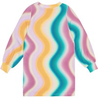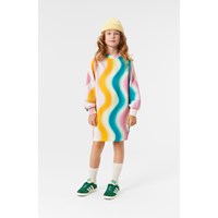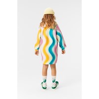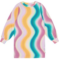 Een veelkleurige jersey jurk van een zachte katoenmix in een ruimvallende pasvorm. De jurk heeft geribbelde boorden rond de hals en mouwen, evenals een gevoerde binnenkant dat het aangenaam koel maakt op een warme dag. De all-over print bestaat uit vloeiende graffiti strepen in tinten groen, blauw, geel en roze.