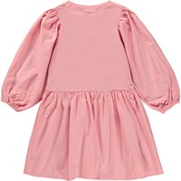 Roze knielange jurk met popeline mouwen en rok. Deze jurk is van 100% katoen, heeft een ronde hals met ribboord, lange volle mouwen met elastiek en een gerimpelde rok met veel bewegingsvrijheid. Het heeft een normale pasvorm.