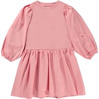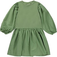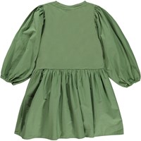Groene knielange jurk met popeline mouwen en rok. Deze jurk is van 100% katoen, heeft een ronde hals met ribboord, lange volle mouwen met elastiek en een gerimpelde rok met veel bewegingsvrijheid. Het heeft een normale pasvorm.