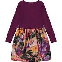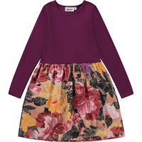 Paarse knielange jurk met een effen paarse top en een bloemenprint op de rok. De print is van prachtige met de hand geschilderde bloemen. Als je van dichtbij kijkt, kun je de penseelstreken zien. Deze print is echt bijzonder omdat het Molo's eigen, nieuwe versie is van een print die is gemaakt door een zijdewever in Lyon, Frankrijk. De wever heeft gewerkt met alle grote namen in de mode zoals Givenchy, Balenciaga, Chanel, Dior en nu ook Molo kids. Deze jurk is van 100% katoen, heeft een ronde hals, lange mouwen, een aangenaaide rok met print en een normale pasvorm.