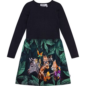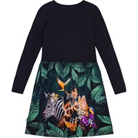 Zwarte jurk met lange mouwen van biologisch katoen. Het bovenstuk sluit nauw aan en is gemaakt van geribbelde jersey, terwijl de rok gemaakt is van gladde jersey. Het is een jurk die ruimte biedt om in te spelen en te bewegen en gemakkelijk is aan te trekken. De rok van de jurk heeft een print van frisse groene bladeren, met feestelijke dieren die erin verstopt zitten.