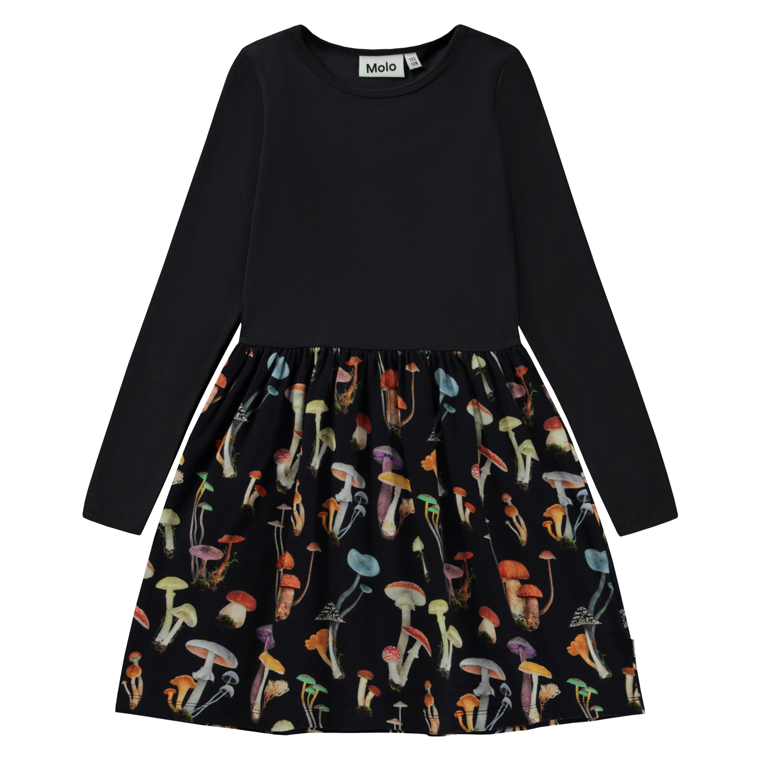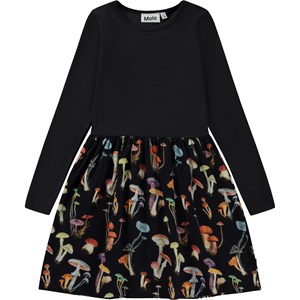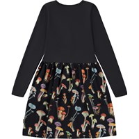 Zwarte knielange jurk met een effen zwarte top en een paddenstoelen print op de rok. De print is een prachtige verzameling van paddenstoelen die samen kunnen zijn gekomen tijdens een mooie herfstwandeling door het bos. Het is grafisch, prachtig en simpel. Deze jurk is van 100% katoen, heeft een ronde hals, lange mouwen, een aangenaaide rok met print en een normale pasvorm.