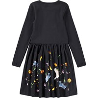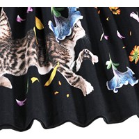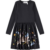 Zwarte jurk met lange mouwen gemaakt van zachte biologische katoenen jersey. Het bovenstuk heeft een aansluitende pasvorm van geribbelde jersey en de rok is gemaakt van rekbare jersey met een schattige print van een kat in een kleurrijke bloemenregen. Het is een comfortabele jurk met veel bewegingsvrijheid.