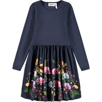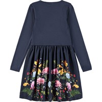 Donkerblauwe jurk met lange mouwen gemaakt van biologisch katoen. Het bovenstuk is strak en van geribbeld jersey en de rok is van glad jersey gemaakt om ruimte te geven om te spelen en te bewegen. De rok van de jurk heeft een print van bloemen en bladeren en is makkelijk aan te trekken.