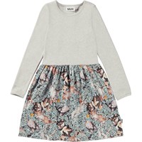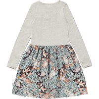 Casie is een jersey jurk met lange mouwen van biologisch katoen. De top is lichtgrijs gemêleerd en de rok in de print Park Life, waarop kittens en puppy’s rollen in hopen blauwe bloemen.