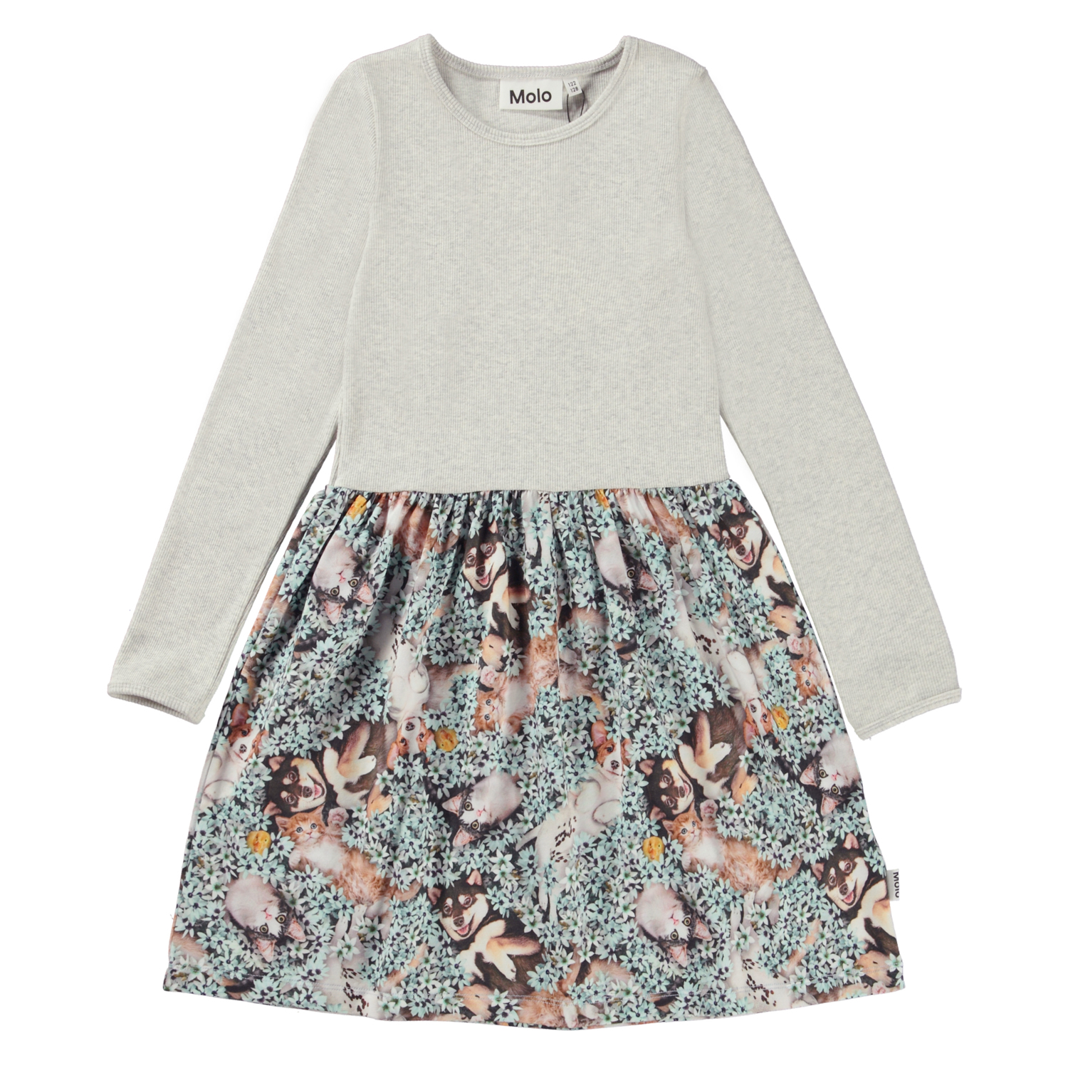 Casie is een jersey jurk met lange mouwen van biologisch katoen. De top is lichtgrijs gemêleerd en de rok in de print Park Life, waarop kittens en puppy’s rollen in hopen blauwe bloemen.