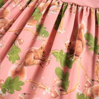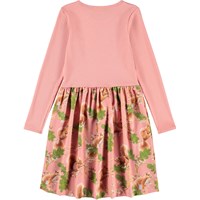 Roze jurk gemaakt van biologisch katoen met lange mouwen, een aansluitende top van geribbeld jersey en een gladde jersey rok. De jurk is makkelijk aan te trekken en biedt volop ruimte om te spelen en te bewegen. De rok heeft een print van bladeren en eekhoorns.