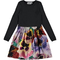 Credence is een jurk in twee delen: het heeft een zwarte top van rib en een rok met een grote bloemenprint.