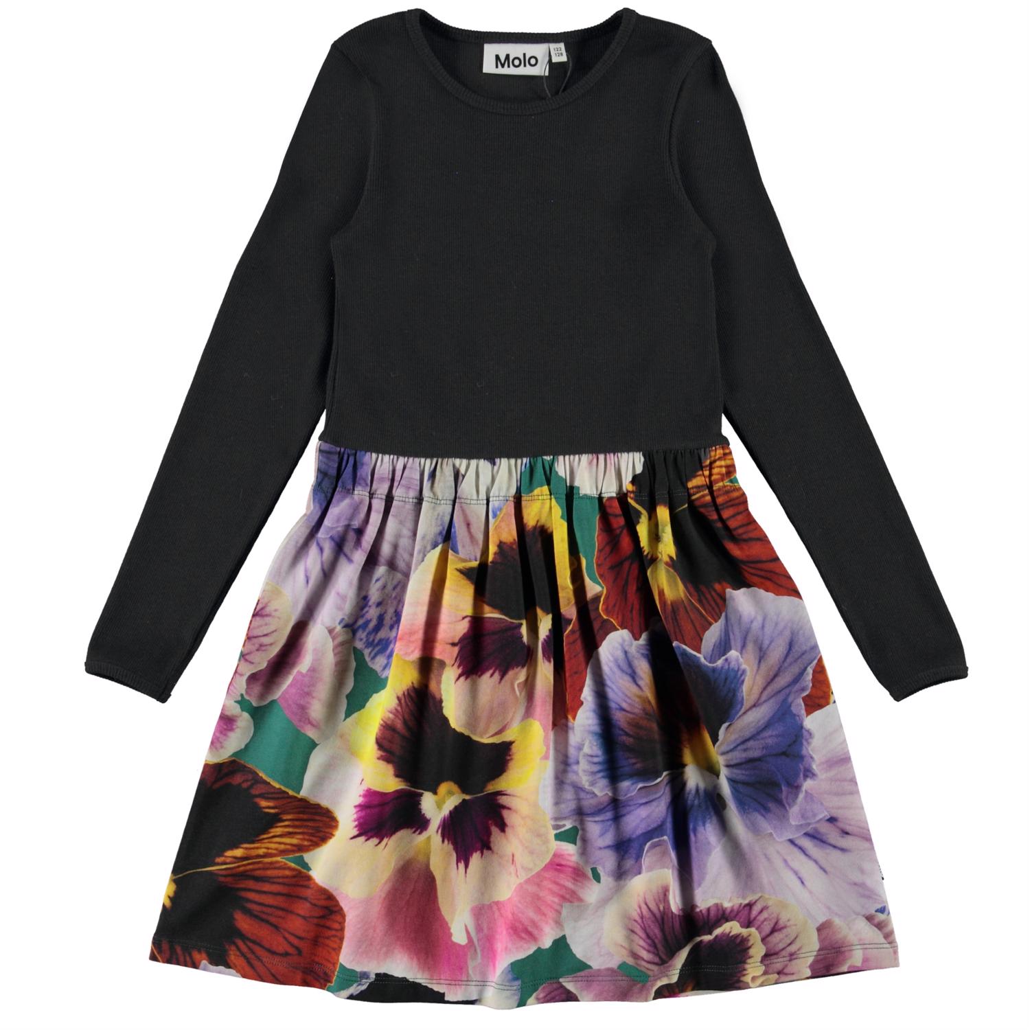 Credence is een jurk in twee delen: het heeft een zwarte top van rib en een rok met een grote bloemenprint.