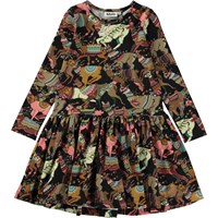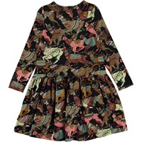 Zwarte knielange jurk met een lama print. De humoristische print toont twee lama's die Molo's eigen breiwerk dragen, zoals mutsen, infinity sjaals en truien. Deze jurk is van 100% katoenen jersey, heeft een ronde hals, lange mouwen en een gerimpelde rok met veel bewegingsvrijheid. De jurk heeft een normale pasvorm.