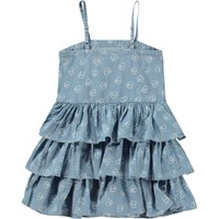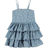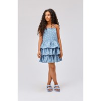 Crystal is een blauwe jurk van biologisch katoen. Het heeft verstelbare schouderbandjes en de rok is in meerdere lagen die een lichte en leuke look creëren. De print van de jurk bestaat uit kleine, lichtgekleurde vredestekens in de vorm van hartjes.