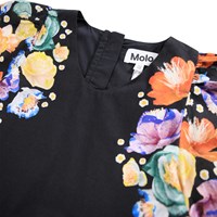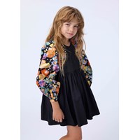 Korte zwarte jurk gemaakt van biologische katoenen popeline. Het heeft prachtige kleurrijke bloemen op de mouwen en borst. De jurk heeft een zachte v-hals, is lichtjes oversized en heeft veel plooien rond de mouwen en rok. De lange mouwen hebben een biaisband en knoopsluiting bij de pols om volume aan de mouw toe te voegen. De jurk is gemakkelijk aan te trekken met de onzichtbare rits aan de achterkant.