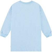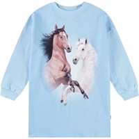 Lichtblauwe jersey kinderjurk van zacht biologisch katoen met ribboord rond de mouwen en hals. De jurk is tot op de knie en heeft een ruimvallende pasvorm met op de voorkant een print van een witte en bruine paard die samen een hart vormen.