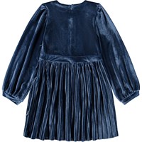 Knielange blauwe fluwelen jurk met lange mouwen, een ronde hals en panelen rond de taille en mouwboorden. De geplooide fluwelen rok voegt een leuk detail toe. De jurk is gemakkelijk aan te trekken met een onzichtbare rits aan de achterkant.