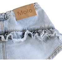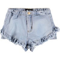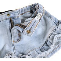 Blauwe korte spijkerbroek gemaakt van katoen met fijne ruches aan de voor- en achterkant. De ruwe rucherand aan de voorkant loopt helemaal rondom. Het heeft een verstelbare elastiek in de taille, goede pasvorm en een knoop- en ritssluiting. De kleinste maten (92–134) hebben drukknopen, terwijl de maten 140–176 een klassieke jeansknoop hebben.
