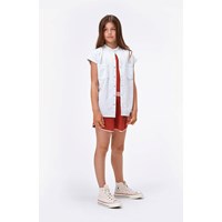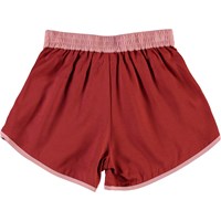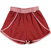 Aja is een rode sportieve short met roze randen en een elastische taille. Aan de zijkanten zijn ze iets korter.