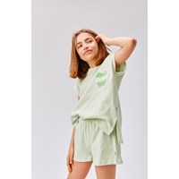 Akima is een lichtgroene short met elastiek van 100% katoen. De short heeft elastiek in de taille en het "Groovy Green" borduursel onderaan een pijp.