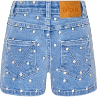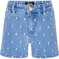 Blauwe denim short met geborduurd gebroken witte stippen. Het heeft een comfortabele pasvorm, een goudkleurige knoop en ritssluiting en riemlusjes.