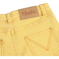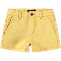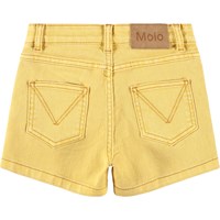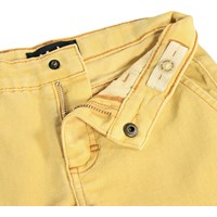 Gele korte spijkerbroek met voorzakken, opgestikte achterzakken en een verstelbare elastische tailleband voor optimale pasvorm. De kleinste maten (92-134) hebben een drukknoop en de maten 140-176 hebben een klassieke jeansknoop.