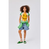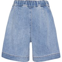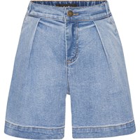 Wijde blauwe korte spijkerbroek met plooien voor en elastiek achter in de taille. De korte spijkerbroek heeft zakken aan de voorkant en een knoop- en ritssluiting.