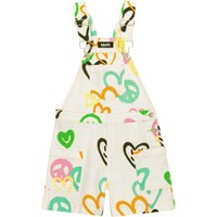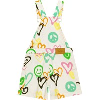 Witte korte spijkertuinbroek met verstelbare bretels, drukknopen aan de zijkanten en zakken aan de voor- en achterkant. De tuinbroek valt op knielengte en heeft een kleurrijke hartjes graffitiprint.