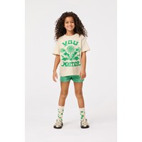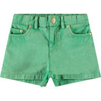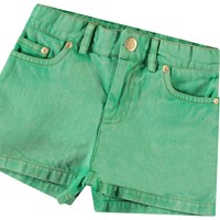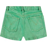 Groene korte spijkerbroek van biologisch katoen. De korte broek heeft een gouden knoop, ritssluiting, vier zakken en een elastische tailleband, waardoor het gemakkelijk aan te trekken is en een goede pasvorm garandeert.