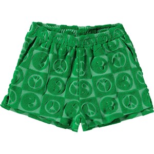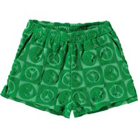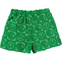 Groene badstoffen korte broek van een zachte katoenmix met een blokjesmotief. Het patroon bestaat uit gelukkige emoji's, Yin Yang symbolen en peace tekens. Deze korte broek valt tot halverwege de bovenbenen en heeft een elastische taille, zakken en kleine splitten aan de zijkanten. Het heeft een normale pasvorm. De zachte badstof kwaliteit en de ruime pasvorm van de korte broek is ideaal om te dragen op het strand of bij het zwembad.