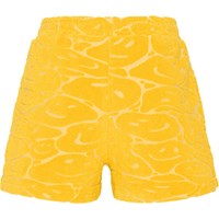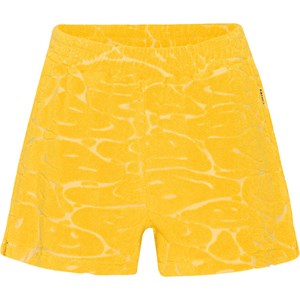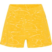 Sportieve gele short van zacht katoenen badstof. Het heeft een ruimvallende pasvorm, steekzakken en een brede elastische taille met koordje waardoor het gemakkelijk aan te trekken is. In de gele badstof zit een smiley geweven. Katoenen badstof is uiterst comfortabel en droogt snel na het zwemmen.
