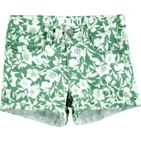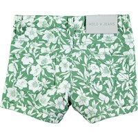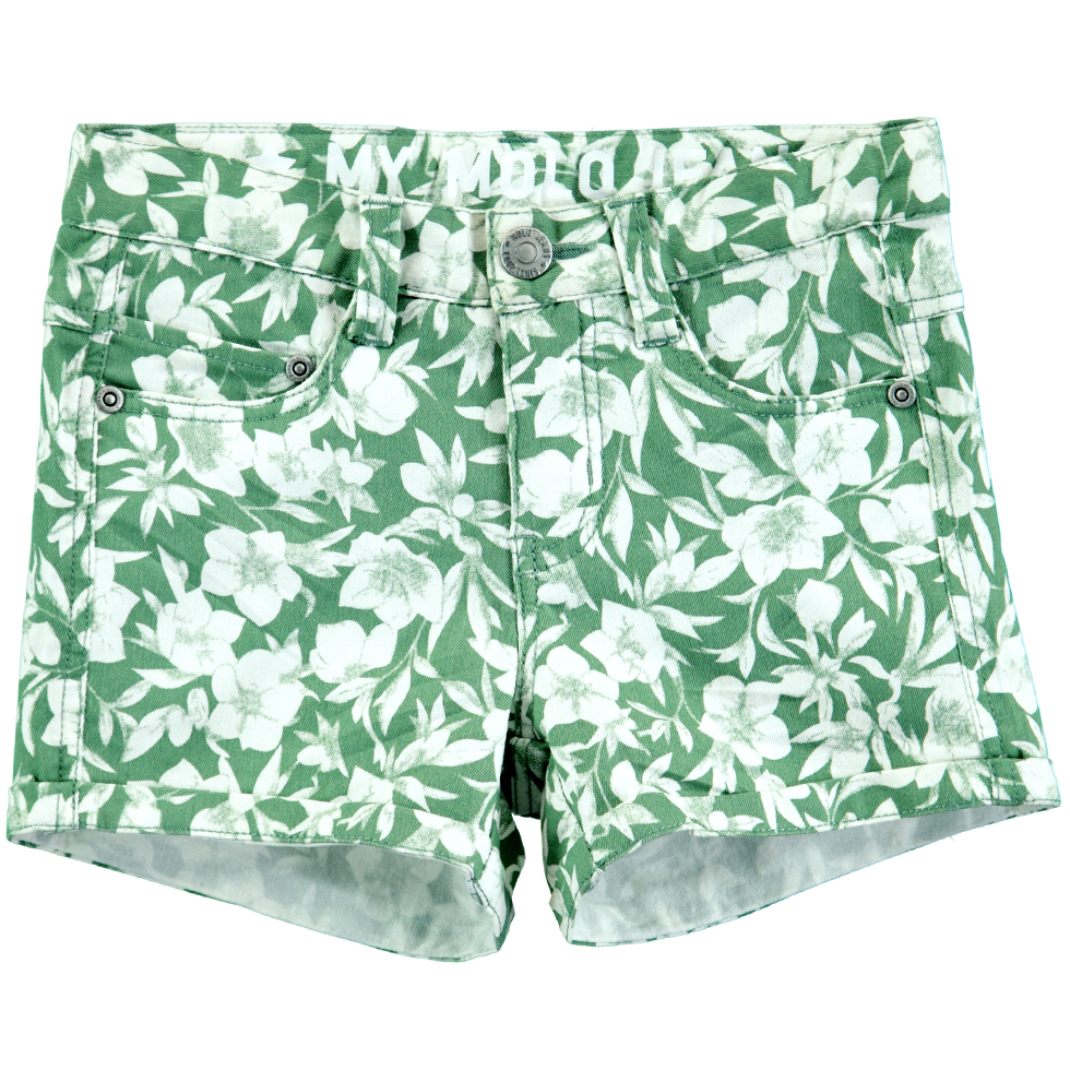 Groene, strakke spijkerbroek met bloemenprint. De short heeft een verstelbare, elastische taille met knopen, riemlussen, een leren patch, zakken op de voor- en achterkant en een omslag aan de broekspijpen. Merk op dat de maten tot en met 128 een drukknop hebben, maten vanaf 134 hebben een jeansknoop.