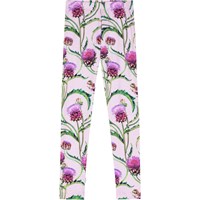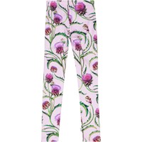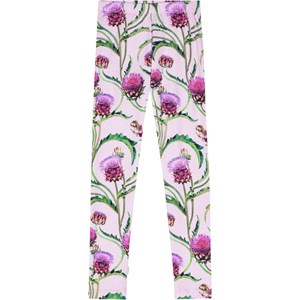 Roze legging van biologisch katoen. Het is nauwsluitend comfortabel en gemakkelijk aan te trekken. De legging heeft een print van artisjokbloemen in de kleuren rood, paars en groen.
