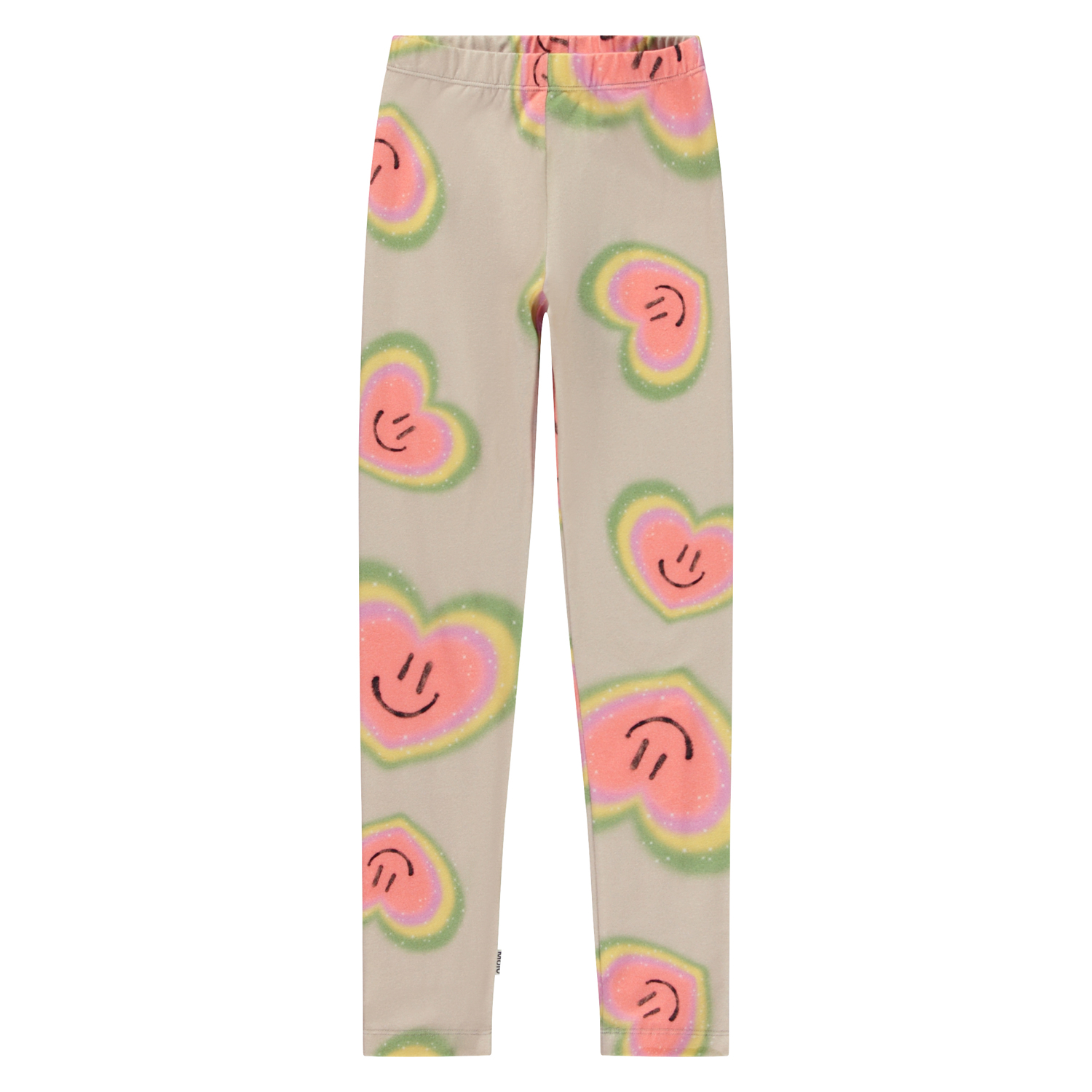 Beige legging met een aura hartjes print. Stel je voor dat alles een aura heeft: mensen, planten en dieren. De print is van aura hartjes die gloeien van kleuren, glimlachen en liefde. Aura kleuren zijn als de kleuren van de regenboog en weerspiegelen de gevoelens van onze innerlijke geest. We zijn bereid ons hart te openen voor alle dingen die we niet kunnen zien en geloven dat er meer in het leven is dan wat onze ogen kunnen zien. Deze legging is van 100% katoen, heeft elastiek in de taille en is slim fit.