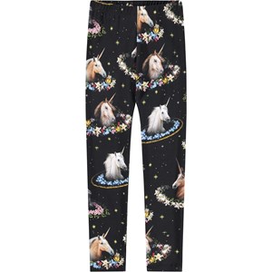 Zwarte legging gemaakt van biologisch katoen in een aansluitende pasvorm met een elastische taille voor maximaal comfort en om het gemakkelijk aan te trekken. De legging heeft een eenhoornprint.