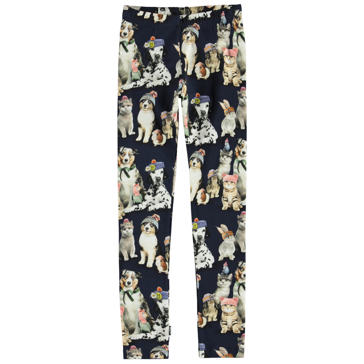 Molo's klassieke lange legging in het donkerblauw met een print van verschillende dieren die mutsen en haarbanden dragen. Het is gemaakt van een rekbare katoenmix en de elastische taille zorgt voor een goede pasvorm.