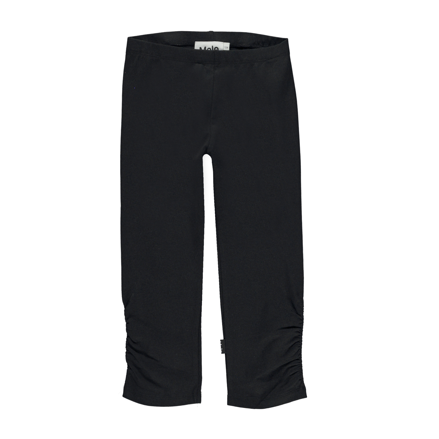 Nila is een zwarte broek van biologische jersey. De broek heeft elastiek in de taille en ruches in de zijnaden onderaan beide pijpen.