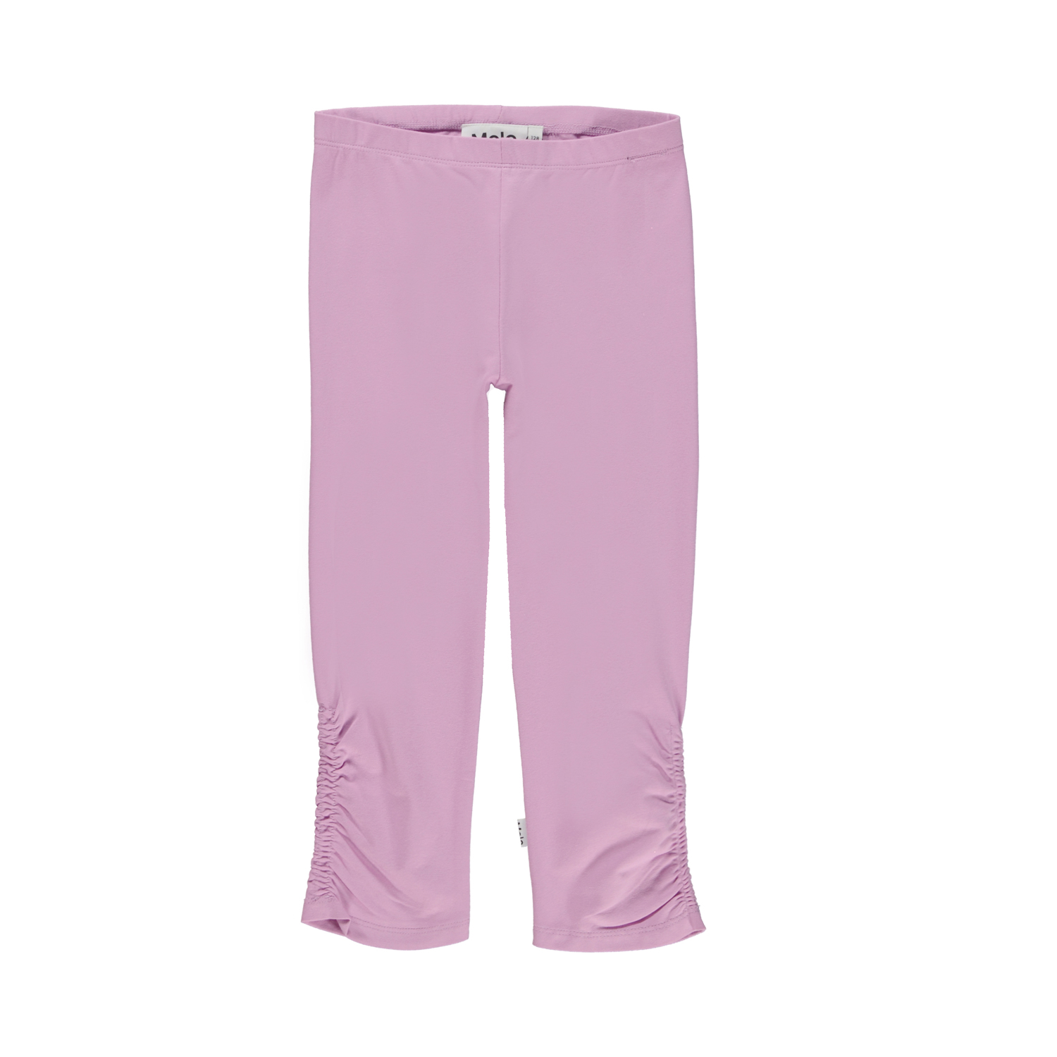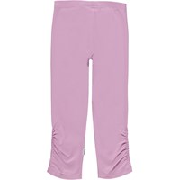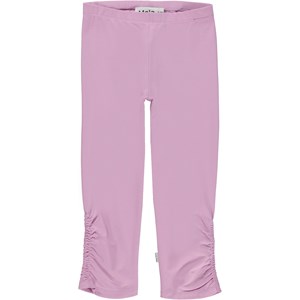 Nila is een roze broek van biologische jersey. De broek heeft elastiek in de taille en ruches in de zijnaden onderaan beide pijpen.