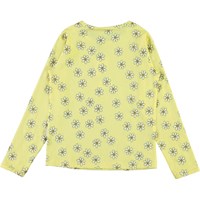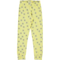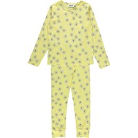 Pyjama in lichtgeel met een bloemenprint. Het broekje heeft koordjes in de taille en het topje heeft lange mouwen.