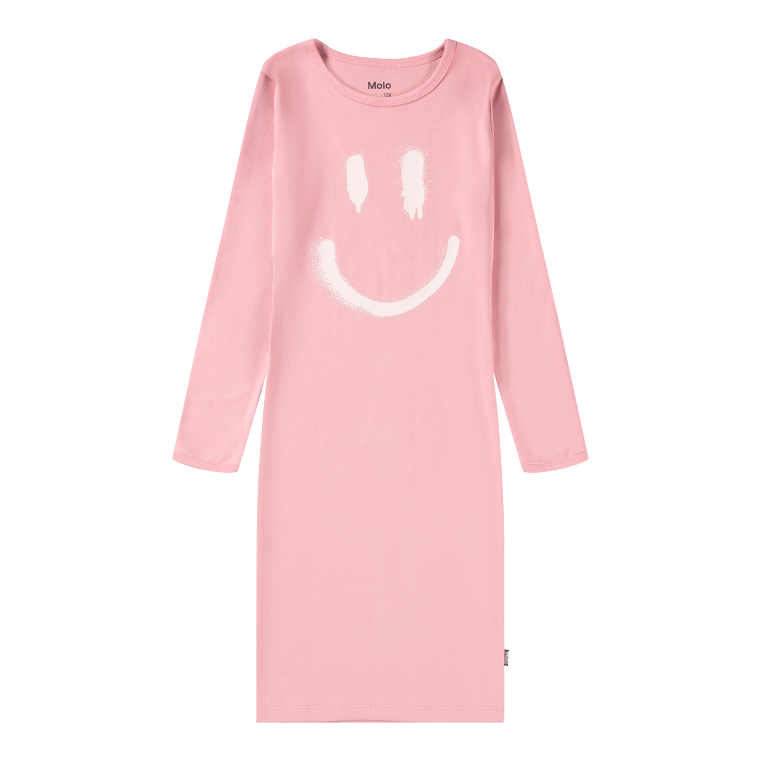Roze nachthemd gemaakt van biologisch katoen met een print van een lachend gezicht. De nachthemd heeft een ruimvallende pasvorm met lange mouwen en een ronde hals. Het zachte katoen voelt comfortabel aan op het lichaam en biedt voldoende bewegingsruimte.