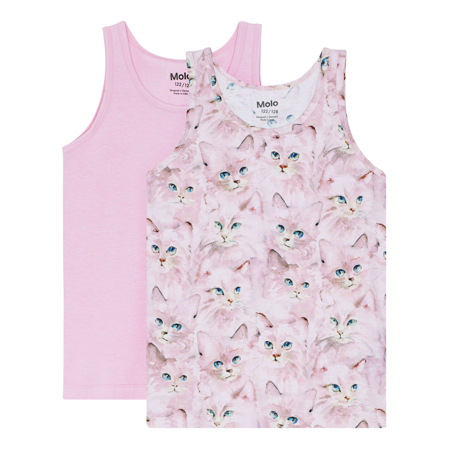 Duopak hemdjes van biologisch katoen. Eén is roze en de ander heeft een all-over print van poezen in verschillende tinten roze. Combineer het met de bijpassende onderbroeken voor een complete set.