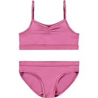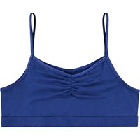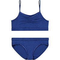 Donkerblauwe stretch-ondergoed gemaakt van zachte viscose. Het topje heeft dunne elastische bandjes en een geplooide naad aan de voorkant, wat het topje een mooie snit geeft. Zowel het topje als het broekje hebben een brede elastische band, wat zorgt voor een goede pasvorm en comfortabel comfort.