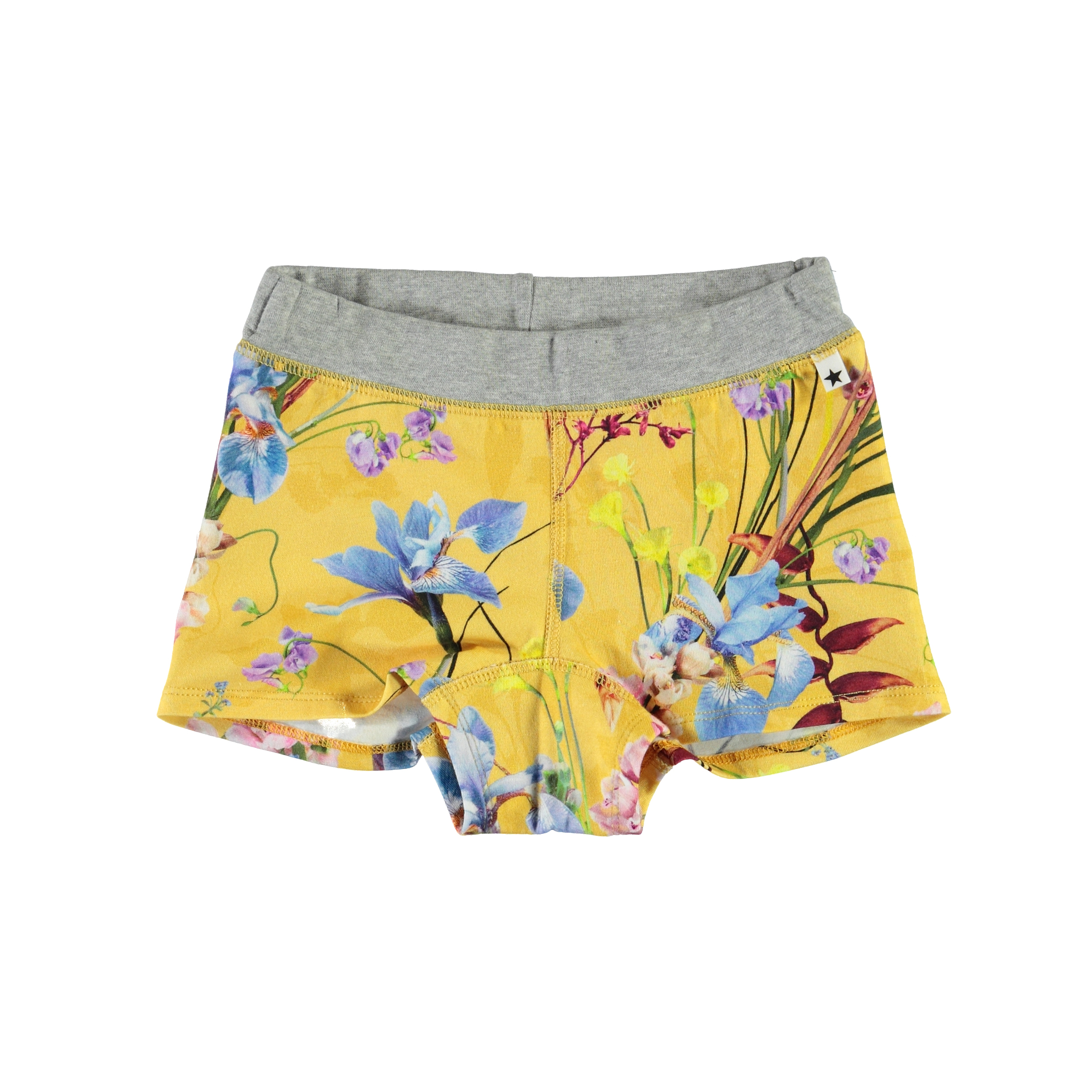 Joanna is een boxer in een bloemenprint op een gele achtergrond. Het heeft een brede elastische taille en zichtbare stiksels.