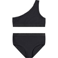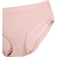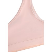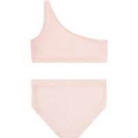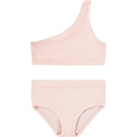 Roze setje ondergoed gemaakt van zacht en elastisch viscose. Het setje heeft een asymmetrische top en bijpassende slip. Beide stukken hebben smalle elastische banden langs de openingen en een brede elastische rand in de taille, wat zorgt voor een comfortabele en flexibele pasvorm.