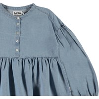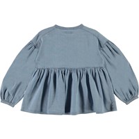 Raluca is een lichtblauw spijkerblouse in een wijde pasvorm en grote mouwen die prachtig vallen. De blouse  heeft plooitjes  in de taille .