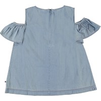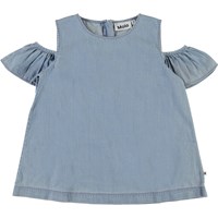 Refas is een lichtblauwe spijkertop met uitgesneden schouders. De top heeft een ritssluiting aan de achterkant.
